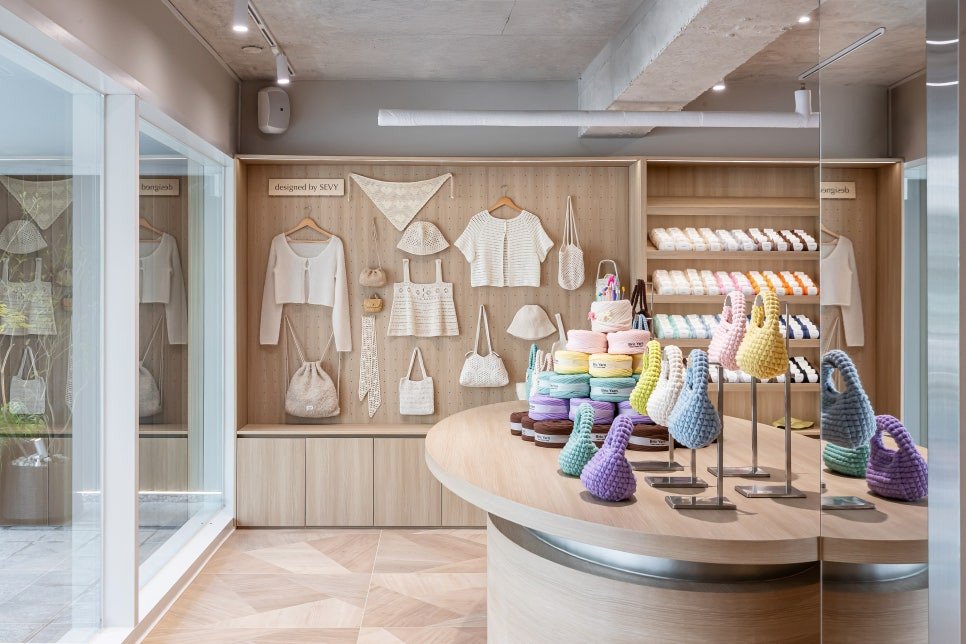 2층 상설판매존. 선반 대신 원형 구조로 구성해 동선이 편리하며, 스타일별 대표 뜨개실을 직접 보고 비교할 수 있다. ©SEVY