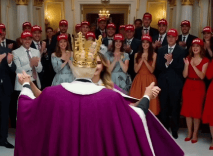 31์ผ ์‚ฌํšŒ๊ด€๊ณ„๋ง์„œ๋น„์Šค(SNS) ์—‘์Šค(X) ๋“ฑ์—๋Š” ํŠธ๋Ÿผํ”„ ๋Œ€ํ†ต๋ น์ด ์‹ ๋ผ ๊ธˆ๊ด€์„ ์“ด ์ฑ„ ๋ถ€์ธ ๋ฉœ๋ผ๋‹ˆ์•„ ์—ฌ์‚ฌ์™€ ์ถค์ถ”๋Š” ๋ชจ์Šต์„ ๋‹ด์€ ํ•ฉ์„ฑ ์˜์ƒ์ด ์˜ฌ๋ผ์™”๋‹ค. ์˜์ƒ ์† ๋‘ ์‚ฌ๋žŒ์€ ์™•๊ถ์œผ๋กœ ๋ณด์ด๋Š” ๊ณต๊ฐ„์—์„œ ์†์„ ๋งž์žก๊ณ  ํ•จ๊ป˜ ์ถค์„ ์ถ”๊ณ  ์žˆ์œผ๋ฉฐ,  ์ด๋“ค์„ ๋‘˜๋Ÿฌ์‹ผ ๋‹ค๋ฅธ ์‚ฌ๋žŒ๋“ค์€ ํŠธ๋Ÿผํ”„ ๋Œ€ํ†ต๋ น์˜ ๊ตฌํ˜ธ์ธ 'MAGA(Make America Great Again·๋ฏธ๊ตญ์„ ๋‹ค์‹œ ์œ„๋Œ€ํ•˜๊ฒŒ)'๊ฐ€ ์ ํžŒ ๋ชจ์ž๋ฅผ  ์“ด ์ฑ„ ๋ฐ•์ˆ˜๋ฅผ ์น˜๊ณ  ์žˆ๋‹ค.
